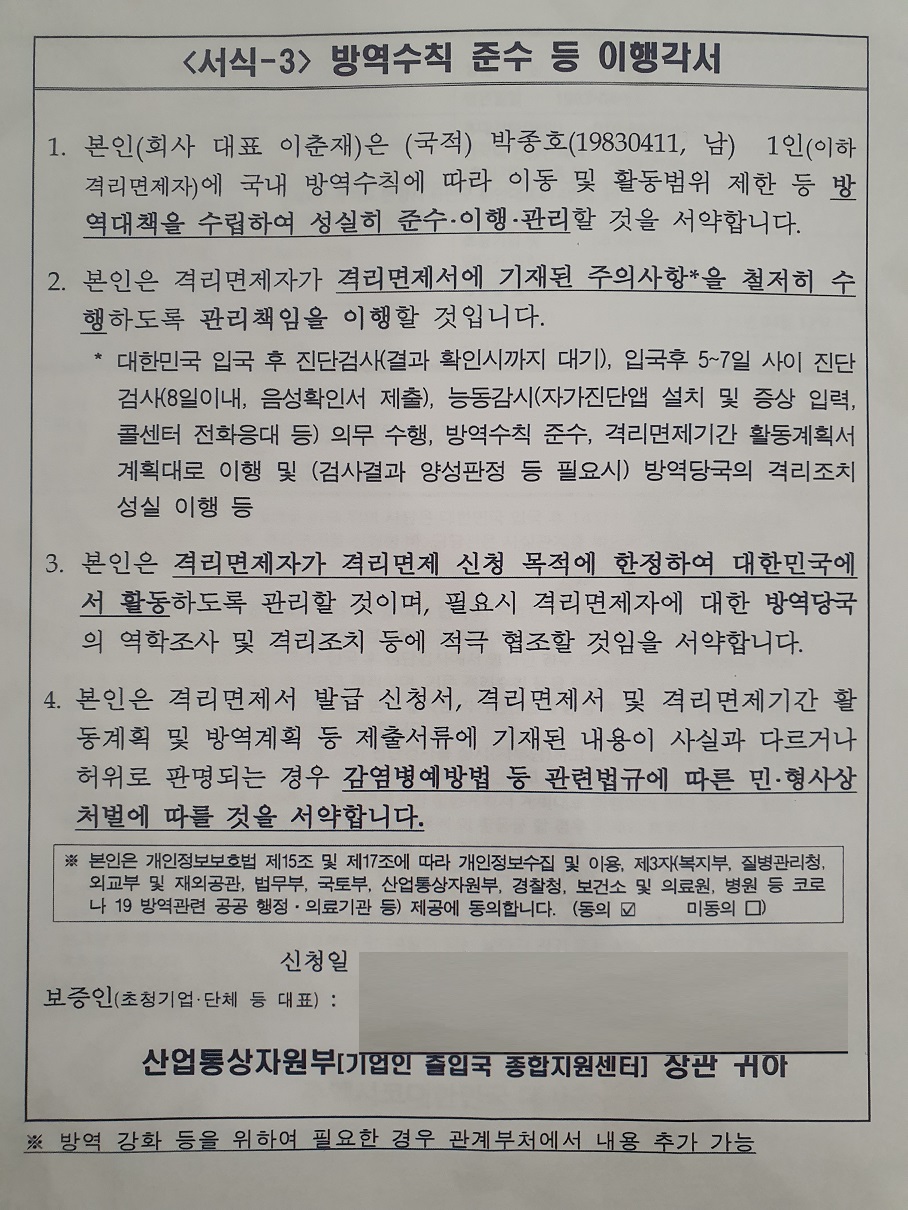 격리 면제 이행 각서