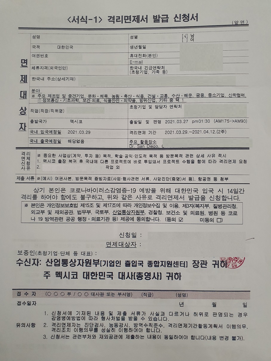 격리 면제서 -. 격리 면제 신청서 1장