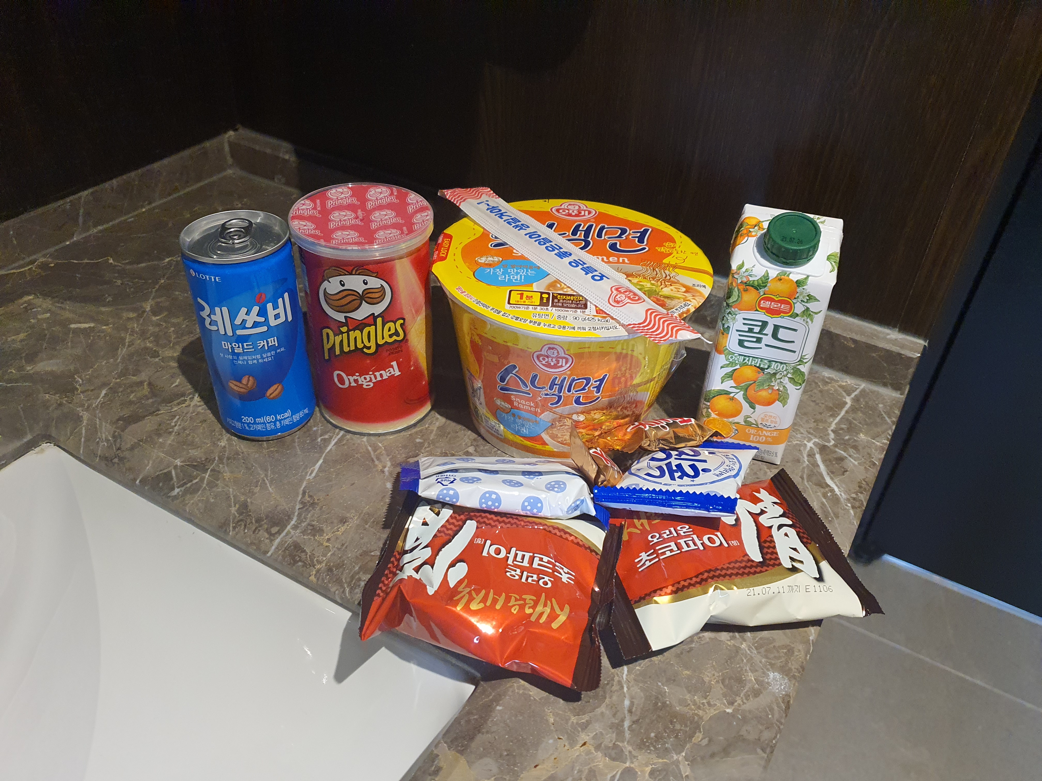 코로나 검사 후 방에 올라가기 전에 이동 때문에 먹지 못한 아침 대신 허기를 달래라고 스낵을 준비했으니 들고 가라고 한다.