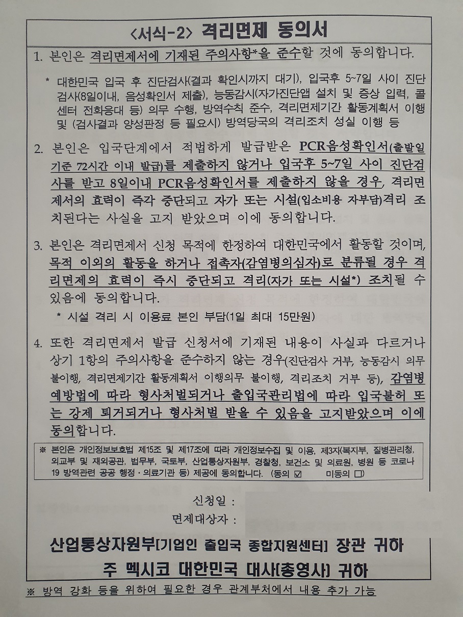 격리 면제서 신청서 2
