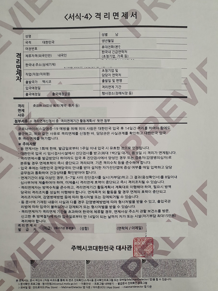 일단 자가격리 면제 서류는 회사에서 신청하고 준비해 줬다.